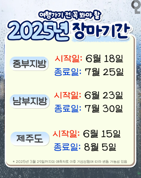이번 글에서는 2025년 장마 시작 시기, 지역별 장마 특징, 예상 강수량, 장마철 날씨 특징, 생활 속 대비 방법 등을 정리하였습니다.