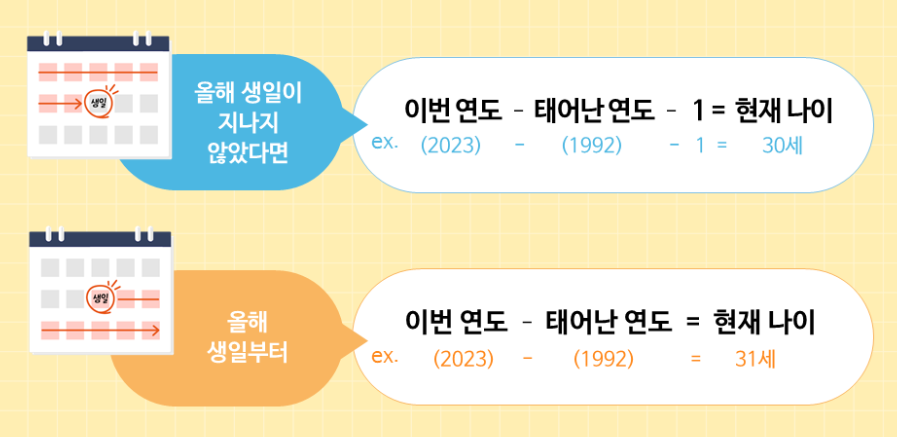 - 만 나이: 출생일을 기준으로 생일이 지나야 나이가 한 살 증가하는 방식입니다. 국제적으로 통용되는 방식이며, 2023년 6월부터 한국에서도 공식적으로 사용되고 있습니다. 한국 나이 계산법은 단순해 보이지만, 실제로는 많은 혼란을 야기했습니다. 특히 만 나이와 한국 나이의 차이로 인해 민감한 문제가 발생하곤 했습니다.