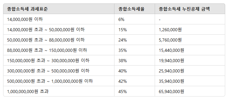 - 누진공제: 576만 원 계산식: (6,000만 원 × 24%) - 576만 원 = 864만원